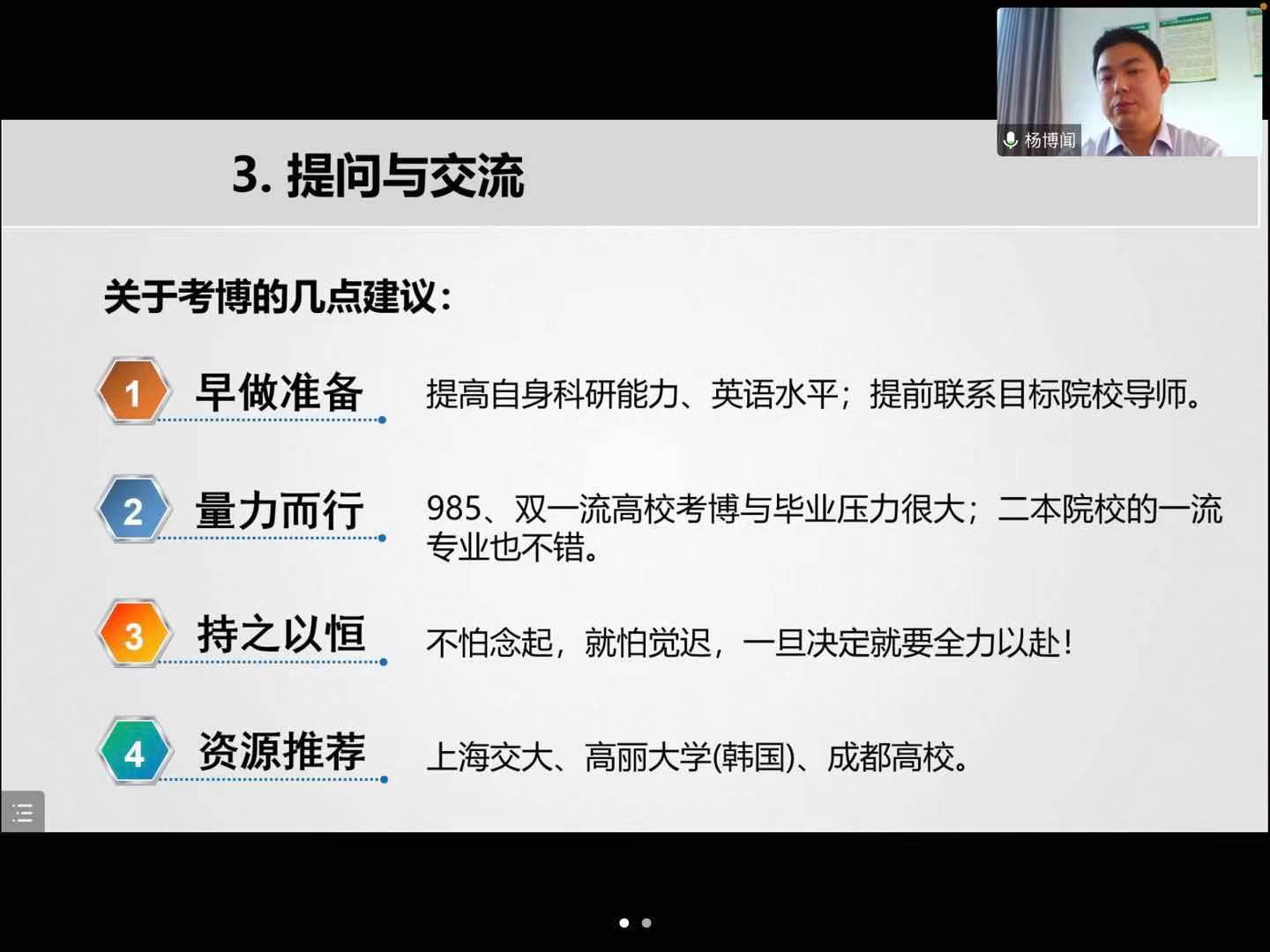 在腾讯会议线上举办“厚德笃学·与榜样励新未来”第一期考博动员系列讲座。本期特邀成都大学副研究员杨博闻老师作为主讲,学院李艳红副院长主持,156名硕士研究生参与了此次讲座。