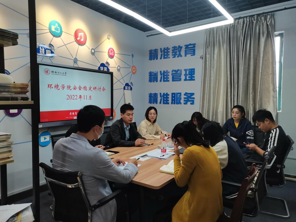 在萃华楼12408大数据工作室组织召开安全稳定研讨会,学院全体专兼职辅导员参加,会议由学院党委副书记郝文佳主持。