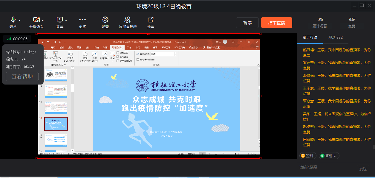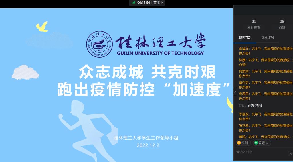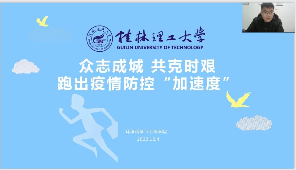 为进一步贯彻落实学校疫情防控工作的各项要求,引导学生深刻理解并严格遵守学校各项防疫举措,增强国家安全意识。12月4日晚,各年级辅导员充分利用成长成才课,以“众志成城、共克时艰,跑出疫情防控“加速度”为主题,开展千名学子共上一堂疫情防控主题“思政大课”活动。