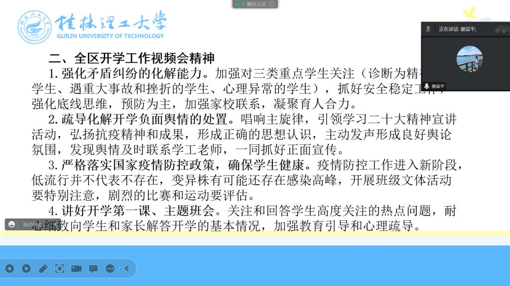 会上, 郝文佳老师强调,当前我国疫情防控工作重心从“防感染”转向了“保健康、防重症”,实施了“乙类乙管”措施,但校园学生基数大、人群密集,学校、师生依然是防控的重点场所和重点群体,容不得一丝懈怠,要准确认识和把握当前疫情防控形势和政策,时刻绷紧疫情防控这根弦,扎实落实好疫情防控各项措施,努力做到稳中求进、稳中有为;要充利用好开学第一课和主题班会做好学生返校前的安全教育,引导树立“每个人都是健康责任第一人”意识,主动解答学生高度关注的问题,加强对心理异常学生、感染新冠病毒学生的关心关怀,并及时给予心理疏导和帮扶,确保春季学期学校安全稳定。