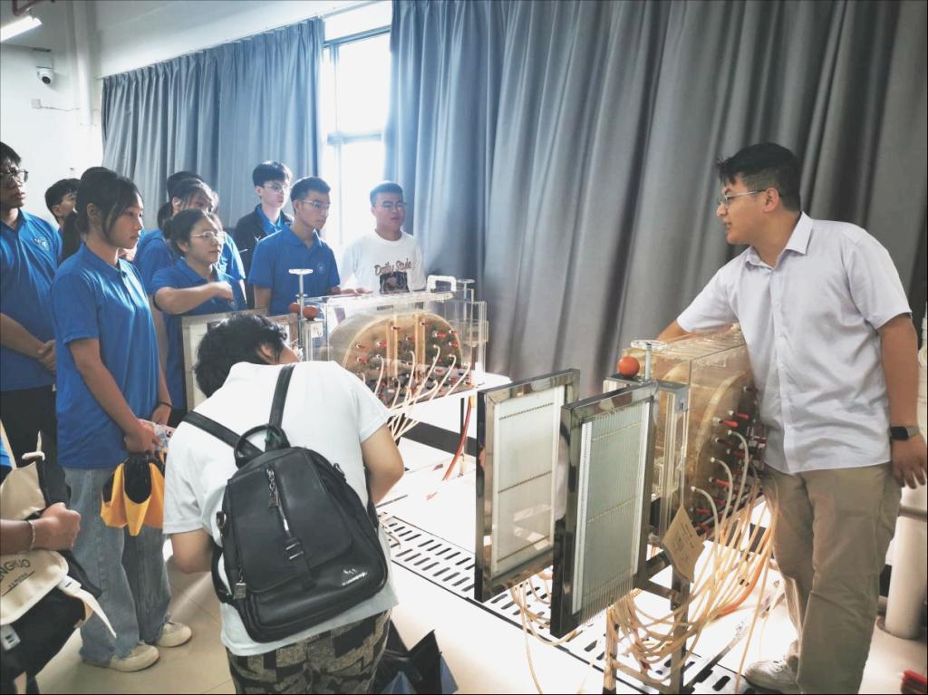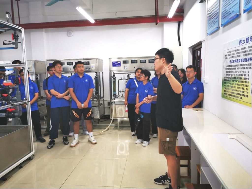 新生参观了基地的双碳主题展厅、供水管网水力模拟展厅,岩溶地下水流动揭秘厅、污水处理工艺等展厅。在实验教师的指导下体验了同层排水系统、城市生活污水净化AAO工艺、潜水及承压水模型,沿程水头损失实验仪、噪声屏蔽系统等众多科普演示项目。