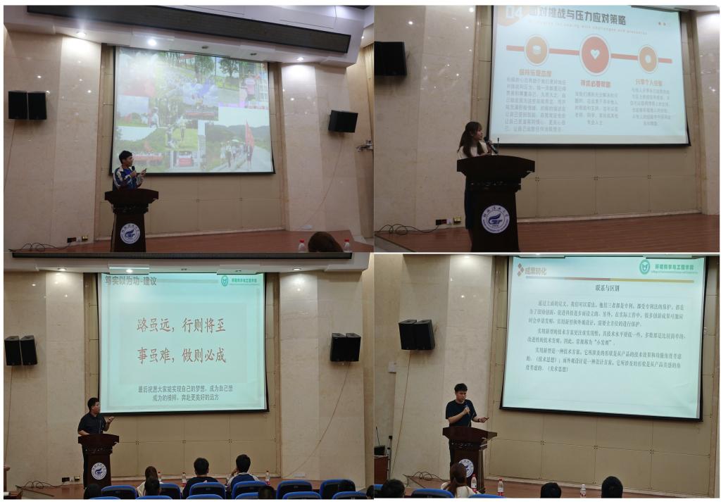 宣讲会伊始,来自环境工程21-实验班的颜玉姣向同学们分享了如何快速适应大学生活的技巧,并介绍了有效的学习方法以及面对挑战、压力的应对策略,激励同学们在艰难时勇挑重担,在平凡生活中追求卓越;随后,水文与水资源工程21-创新班的高鑫瑞结合个人经历,分享了创新竞赛和科研成果转化的心得体会,呼吁同学们要不断锤炼品德、扎实学识、学好专业,努力成为青春赛道上奋力奔跑的人;来自地下水科学与工程专业21-创新班的邵政超以“鲜衣怒马少年时,不负韶华行且知”为主题讲述了自己的成长轨迹,表明自律努力是走向成功的重要秘籍,勉励同学们要坚定理想信念,成为有担当、有本领、有作为的新时代青年。最后,给排水科学与工程21-创新班的张志恒以自身的科研竞赛、志愿服务和四六级备考为切入点,号召同学们要明确目标、脚踏实地、勤学苦干,用奋斗为青春涂抹靓丽底色。
