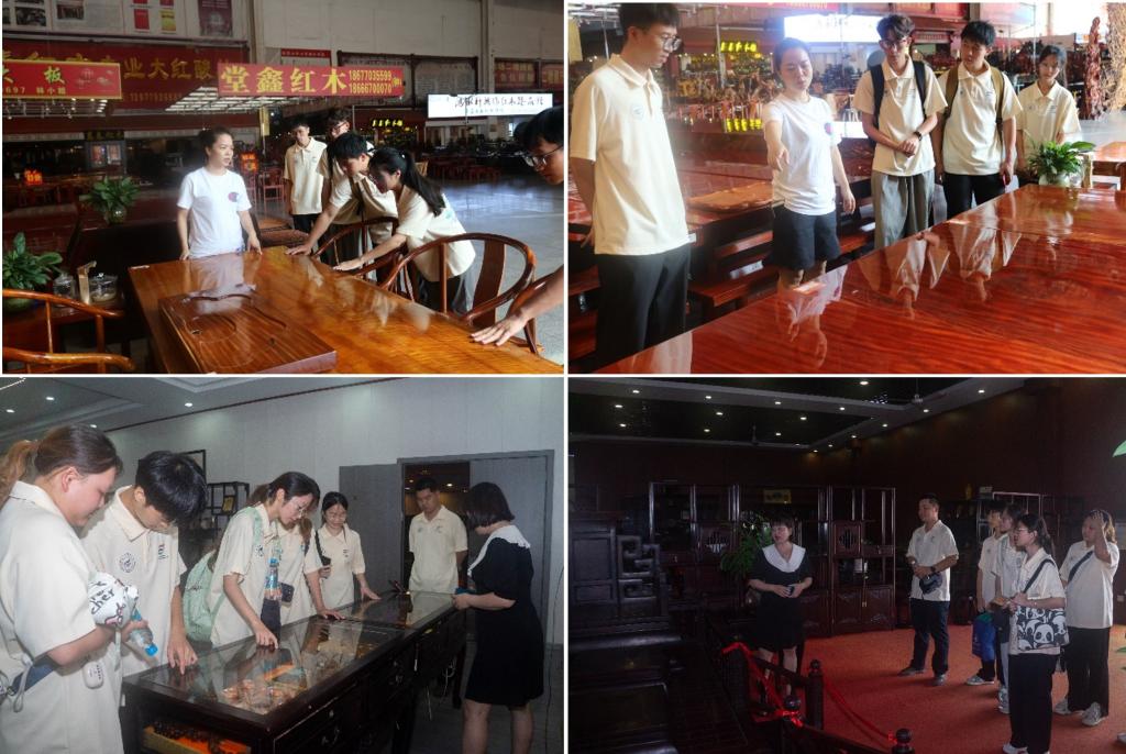 东兴市红木文化中心,这里汇聚了来自东南亚各地的优质红木原料,经由匠人巧手雕琢,化作一件件既蕴含深厚文化底蕴又兼具现代审美价值的家具与工艺品。据文化中心工作人员介绍,东兴是我国重要的红木进口通道,东兴红木产业伴随着中越边境贸易和边境旅游的繁荣而发展。这里的古典红木家具、红木工艺品、木雕、漆器、收藏品等精品红木雕刻全面融入了京族民族风格和东盟国家特点,形成了具有地方民族特色的“东兴红木民族文化”,逐步树立了“东兴红木”形象。触摸着一个个红木产品,实践团成员深刻感受到了东兴红木文化的独特魅力和工匠精神的传承力量。