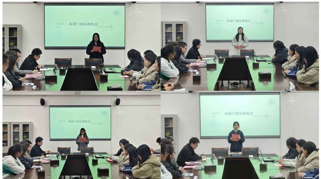 在会议上,社长江亚涛与副社长先本森对社团一学期以来的工作进行了全面而细致的总结,指出了本学期工作中存在的不足,并提出了针对性的解决措施。随后,各部门负责人依次上台,详细汇报了本学期各自部门所取得的工作成果和亮点。紧接着,董翼老师对本学期涌现出的社团先进个人进行了表彰。表彰环节结束后,先进个人代表夏先昊同学上台分享了自己在社团工作中的经验和心得,勉励每一位社团成员都能积极参与社团活动,锻炼自己、提升自己。最后,董翼老师进行了总结发言,他对社团一学期以来取得的丰硕成果给予了高度评价与充分肯定,同时也客观指出了社团目前存在的短板,鼓励大家继续保持锐意进取的精神风貌,不断提升自我能力,为社团的繁荣发展贡献更多力量。