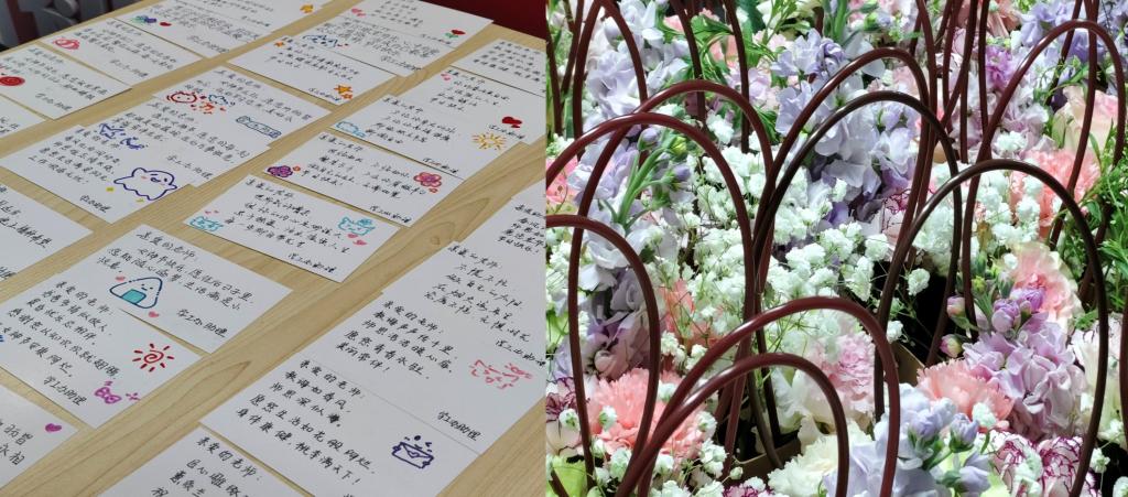 在插花活动现场,近30余名学生在专业花艺师的指导下,充分发挥自己的创意,将一朵朵鲜花,一片片绿叶精心搭配,创作出各具特色的插花作品。通过视觉美感的构建与植物生命力的联结,有效提升了学生的情绪管理能力和自我价值感。随后,学生们带着亲手包装的鲜花走进教师办公楼,向全院近40名女性教师及后勤工作人员送上了鲜花与贺卡,学生们用真诚的文字表达对教师辛勤付出的敬意。收到花束的女教师们面露惊喜与感动,许多教师仔细端详花束造型,反复阅读卡片内容,现场弥漫着温暖与欣慰的氛围。