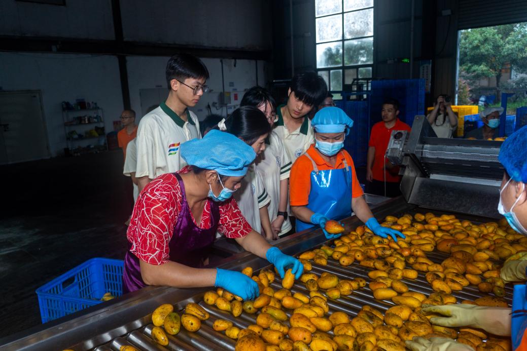 园区展厅内,产业园工作人员向实践团系统介绍了园区定位、产业布局及发展历程。园区依托重大战略机遇,重点发展服装纺织、玩具制造、农产品加工等产业,且始终贯穿“生态优先”理念,严格环保准入标准,配套建设污水处理、废弃物回收等设施,目前已吸引多家农产品加工企业入驻,成为带动农业增效、农民增收的重要平台。随后,实践团走进广西倍格农业科技有限公司,实地参观芒果、百香果等特色水果的分拣、深加工流程,了解企业“减损增效”生产原则、产品远销区内外的成效以及企业果皮、果渣等废弃物资源化处理工艺。结合环境学科专业知识,实践团就废液废渣处理与公司负责人进行了交流。