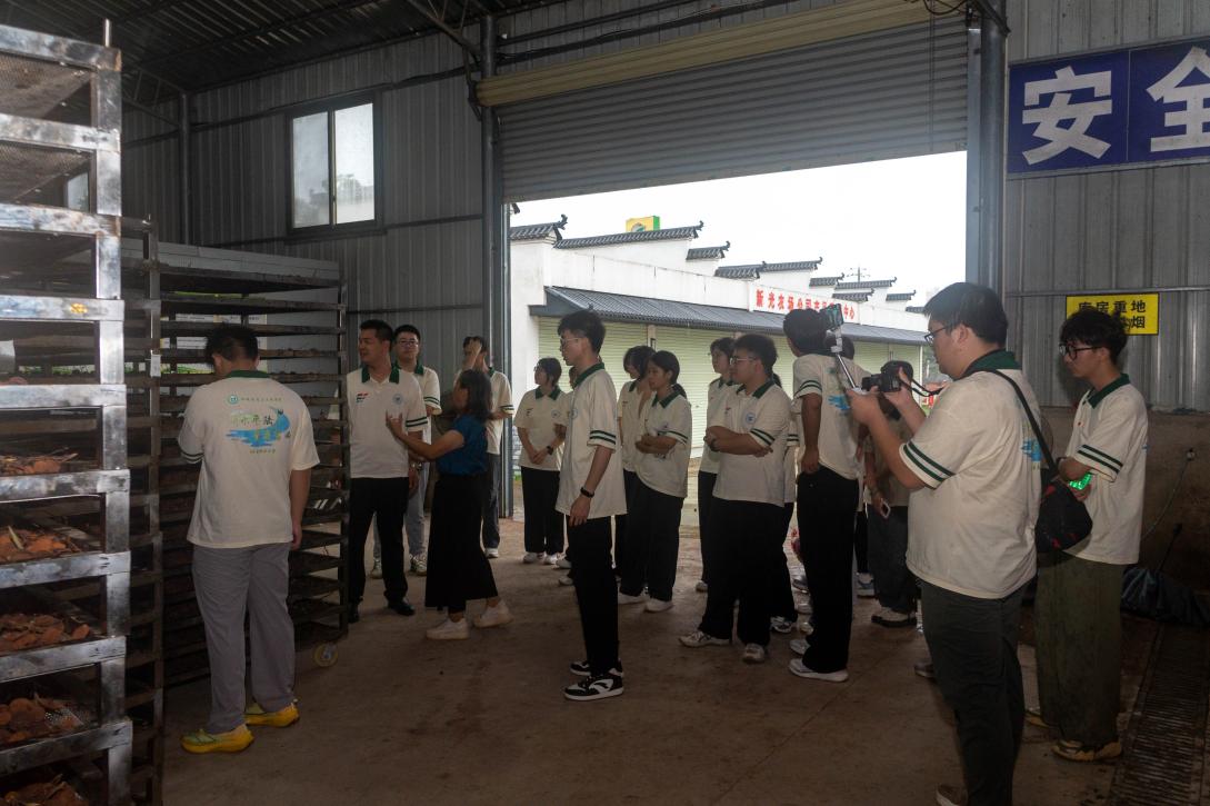 实践团首先在生态园展示厅听取负责人介绍,了解到生态园依托“政府引导+企业带动+农户参与”模式,实现从传统散户种植到规模化运营的转型,构建“种植标准化、管理绿色化、销售品牌化”体系。负责人重点提及,园区以“生态优先”为核心,采用生物防治替代传统农药、有机肥替代化肥,既保障荔枝品质,又守护土地生态,带动周边农户转变种植理念,实现生态效益与经济效益双提升。随后,团队探访荔枝加工区,观摩清洗、分拣、烘干、包装流水线,了解到加工区通过低温烘干技术保留果实营养,延长产业链条,打破鲜果即时销售局限,提升农产品附加值,去年已带动周边50多户农户增收,实践团成员直观感受到绿色农业全链条发展实效。