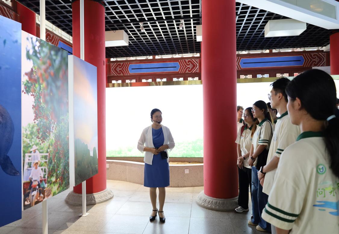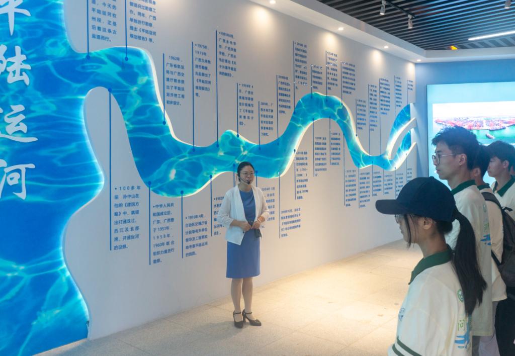 实践团在讲解员引导下登塔研学。塔内展陈的铜鼓、陶器等文物,还原钦州作为古代海上丝绸之路节点的历史辉煌;历史人物展区中,国画大师齐白石“钦州荔枝为果中之王”的佳话彰显地方物产魅力,民族英雄冯子材、刘永福抵御外侮的事迹,让成员深切感悟爱国精神传承。登上塔顶层,实践团通过巨幅画卷了解平陆运河发展脉络。其构想最早源于孙中山《建国方略》,新时代作为国家重大战略工程,规划聚焦航运主导,兼顾供水、灌溉等功能,建成后货物通江达海时间预计缩短15天,将为区域经济高质量发展注入动能。成员凭窗远眺,运河规划线路与城市蓝图交相辉映,直观体会到古今发展的衔接。