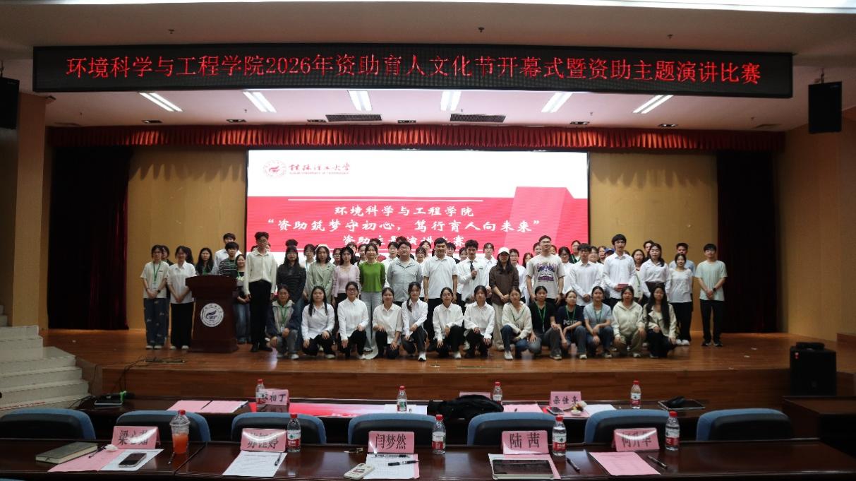 2026年资助育人文化节开幕仪式暨资助主题演讲比赛在雁山校区图书馆报告厅顺利举办。学院学工组长刘砥、团委副书记董翼、专兼职辅导员及170余名学生共同参加活动。