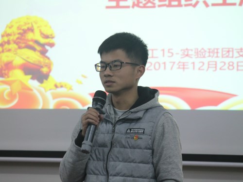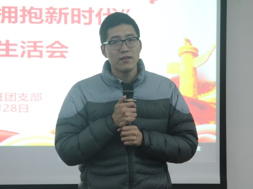 首先,全体支部成员在团支书的带领下,先观看视频——《习近平为你“描绘”新时代》,通过观看视频,同学们了解了中国共产党带领中国人民实现中华民族伟大复兴的中国梦的过程中的不懈努力与辉煌成就。视频观看结束后,郝文佳老师向同学们深刻剖析了党的十九大的精髓,让同学们认识到党的十九大对于自己未来发展的重要性。接下来团支部的四位优秀的预备党员讲述了他们对学习党的十九大的理解与感悟,带领同学们了解了习近平新时代中国特色社会主义思想。预备党员谢佑权同学进行诗朗诵——《勇敢逐梦》,将本次组织生活会的气氛推向高潮。