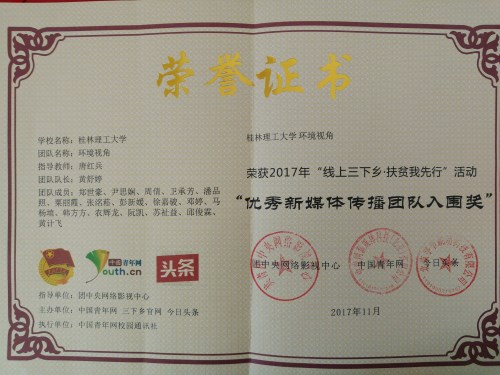 组织实践队成员到桂林市社区、学校、漓江等地开展主题为“环盈盈一水,保资源永续”的调研活动,实践团开展了清洁漓江水域、爱心支教、垃圾分类问卷调查、“CUC”垃圾回收、环保骑行、土壤调研、环保讲座等活动。由于活动组织得力,工作开展扎实,内容丰富多彩,影响范围广泛,活动多次被中青网三下乡官网宣传报道,获得全国百强社会实践团队入围奖、学校暑期“三下乡”优秀团队奖与优秀课题成果入围奖,在此次会议上又受到表彰奖励。