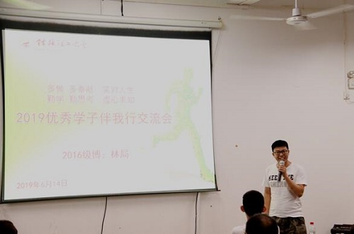 接着,林局博士向我们分享了他的事迹,他说,做人要做到四点:与人为善,脚踏实地,屡败屡战,团结友爱,在分享中,他讲述了师门的团结,互帮互助,百折不挠的桂工精神,他更袒露了从政的决心。