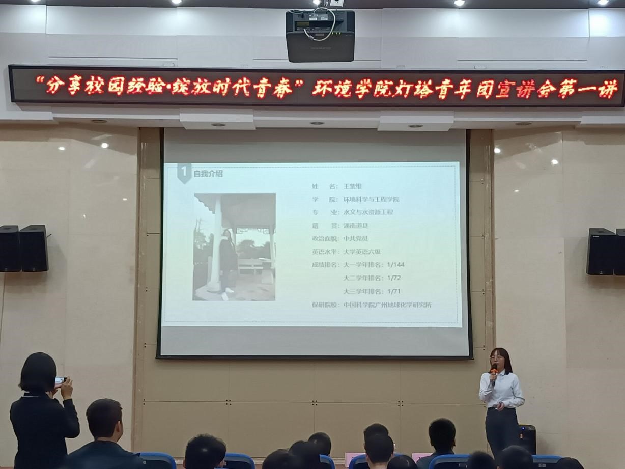 活动开始时,主持人简要介绍了宣讲团第一讲成员,并邀请孙云龙老师上台致辞。孙老师表示“勤学而交流,则博学而睿智”,他希望在相互交流中,同学们可以促进思想的多元化,并做到互通有无、取长补短、相互促进。紧接着,三位宣讲人通过PPT向同学们分享了他们经过不懈努力后,在不同的领域中取得的成就。其中,王紫维同学勤奋好学,在学习的道路上披荆斩棘,攻克一个又一个难关;孔艺衡同学积极开展社会实践,在实践中不断完善自我,突破自我;环工18-1班黄小莉同学积极带领本班同学积极开展班级学风建设,建设一个富有活力的班集体。通过宣讲团成员图文并茂的学习工作的交流分享,引起了同学们的共鸣。宣讲结束后,进行了互动问答环节,三位宣讲团成员均详细回答,为同学们排忧解难,让同学们对未来有更加清晰的认识。最后,在全体人员合影留念中本次活动落下帷幕。