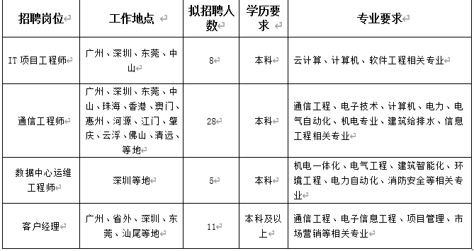 2020年普通高校全日制应届毕业生,通信工程、计算机、信息工程、机电一体化、给排水科学与工程、电气工程、动力工程等理工类专业,本科及以上学历。能够取得学历证书和学位证书。英语成绩四级以上,动手能力强,适应出差,沟通能力强,有一定实习经验或考取相关资格证书者优先。