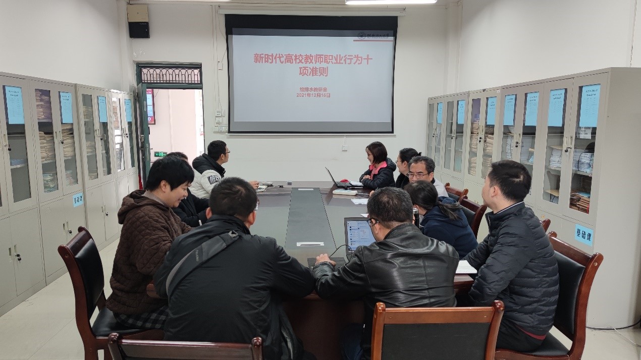 为巩固师德师风教育活动月的学习成果,进一步增强教师的责任感、使命感,进一步弘扬新时代高校教师道德风尚,同时响应学校号召,2021年12月,给水排水教研室组织师德师风教育专项系列学习活动,由徐宇峰主任带领,组织给水排水教研室全体教师学习《新时代高校教师职业行为十项准则》(以下简称《准则》)、《教育部公开曝光4起违反教师职业行为十项准则典型案例》以下简称《案例》)。