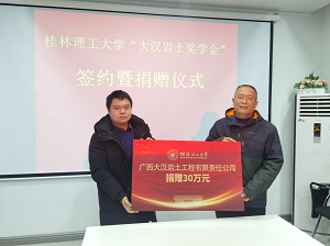 98级校友,多年来感恩于学校为企业的发展培养输送了大量优秀的专业技术人才,为表达对母校的感恩之情,激励我校学生刻苦学习,奋发成才,提升毕业生就业竞争力,促进学校更好地发展,2021年12月28日,广西大汉岩土工程有限责任公司与学校举行了共建教学实习基地仪式,并向学校捐赠30万元,设立校级“大汉岩土奖学金”。