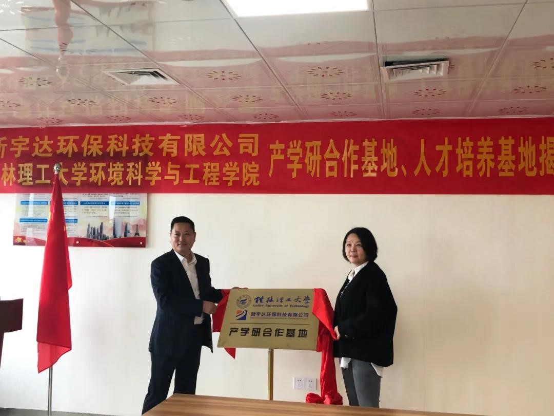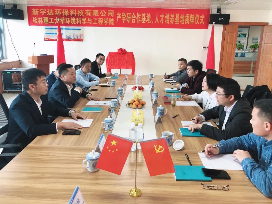 院长曾鸿鹄率队,赴南宁与新宇达环保科技有限公司负责人就产学研及人才培养方面的具体内容展开会谈,会后双方签订“产学研合作与人才培养基地”协议并举行了揭牌仪式。