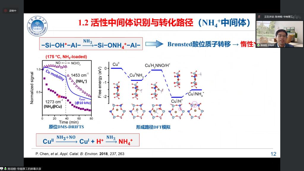 首先,陈培榕老师分享了课题组氮氧化物污染控制化学最新研究进展。介绍了Cu-CHA低温SCR净化NOx机理、Pd-CHA被动吸附净化NOx和逃逸氨排放控制,从原子水平揭示低温SCR动态化学过程原位追踪、高效模拟和反应活性位动态演变。