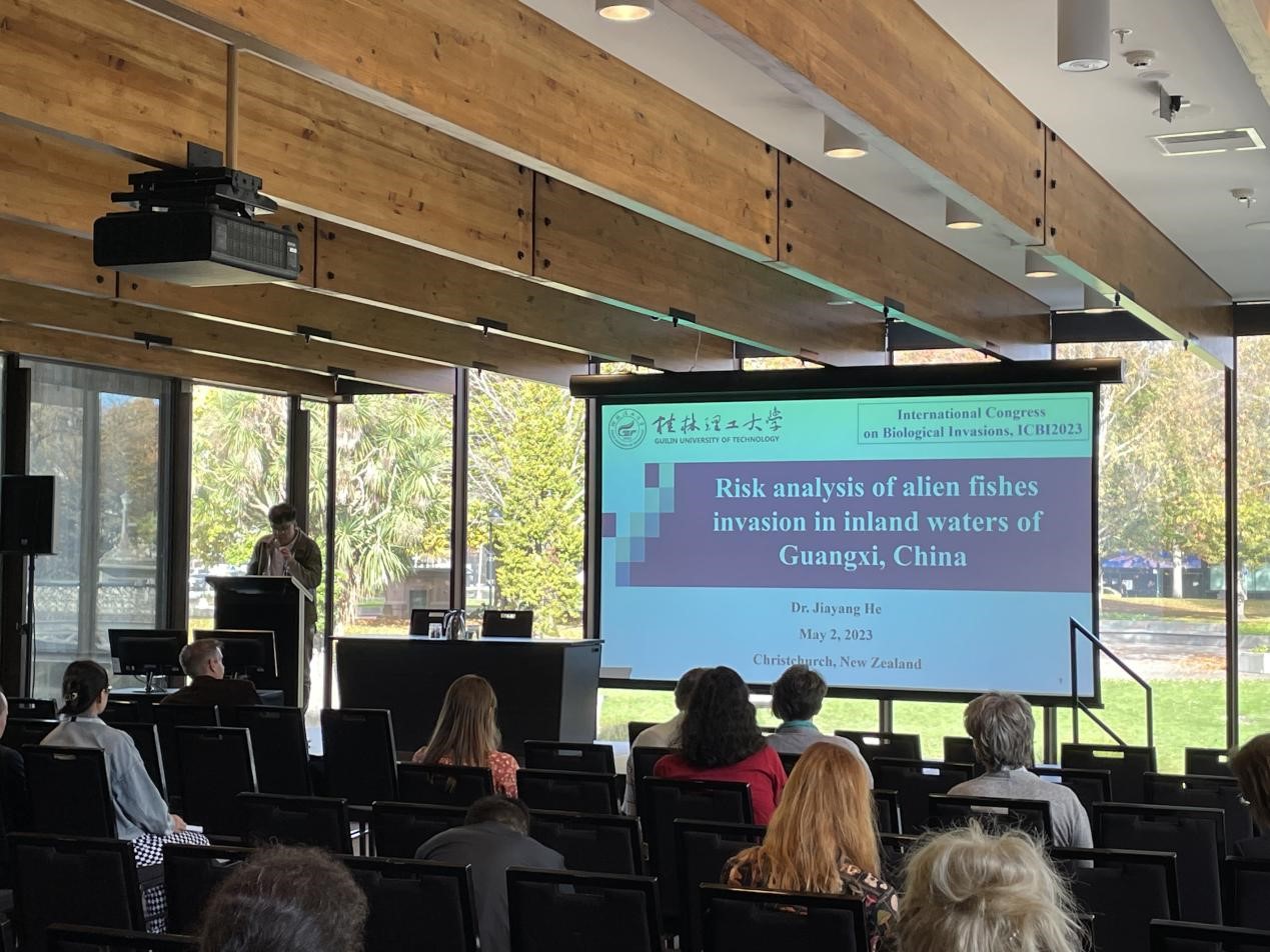 大会上,博士研究生何佳洋在“Risk assessment”专题作了题为“Risk analysis of alien fishes invasion in inland waters of Guangxi, China” 口头汇报,该成果为广西内陆水域的外来鱼类入侵早期防治和管理提供科学依据;博士研究生刘昊在“Environmental impacts”专题作了题为“Species and distribution of exotic fishes invasion in inland waters of Guangxi”的口头汇报,主要介绍了广西内陆水域的外来鱼类入侵较为严重,需严控人为引种、养殖和传播、加强外来鱼类的预警和监测等防控对策。