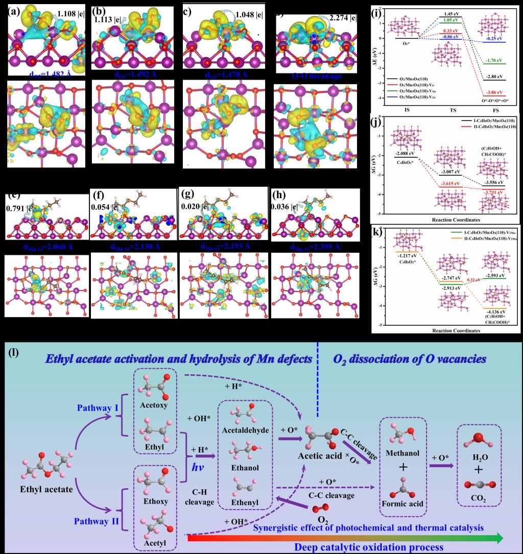 催化剂不饱和缺陷位点作用的理论计算和乙酸乙酯光热降解反应路径示意图