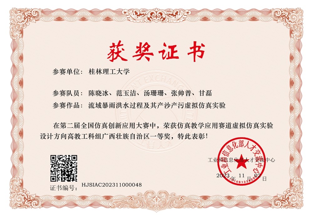 陈晓冰、范玉洁、汤珊珊、张帅普和甘磊教师的团队作品《流域暴雨洪水过程及其产沙产污虚拟仿真实验》获虚拟仿真实验设计方向(高教组)全国二等奖和区级一等奖。