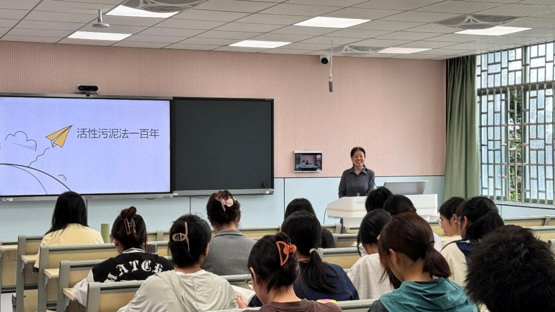 2021级环境工程本科生讲授《水污染控制工程》课程,并为2023级环境科学与工程专业硕士研究生讲授《环境科学与工程前沿讲座》课程。张教授从对维度、多角度生动有趣地讲述了《水污染控制工程》这门课程,包括活性污泥法的起源、活性污泥法的进展和活性污泥法的展望,极大地激发了本科生的学习兴趣。在讲授《环境科学与工程前沿讲座》这门课程时,张教授从自己的科研经历出发,讲述了从光致吸附、光致降解、酶促转化和混凝沉淀等多个方面研究了小分子双酮的界面过程和化学转化中对电子和能量转移的调控作用,既开拓了研究生的科研视野,又提升了研究生的科研能力。