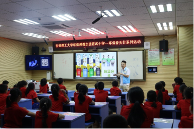 环保科普师生志愿者团队,前往桂林市君武小学开展环保科普宣传教育活动。本次活动共分为科普教育合作交流座谈、环保科普小课堂、环保科普小游戏3个环节。