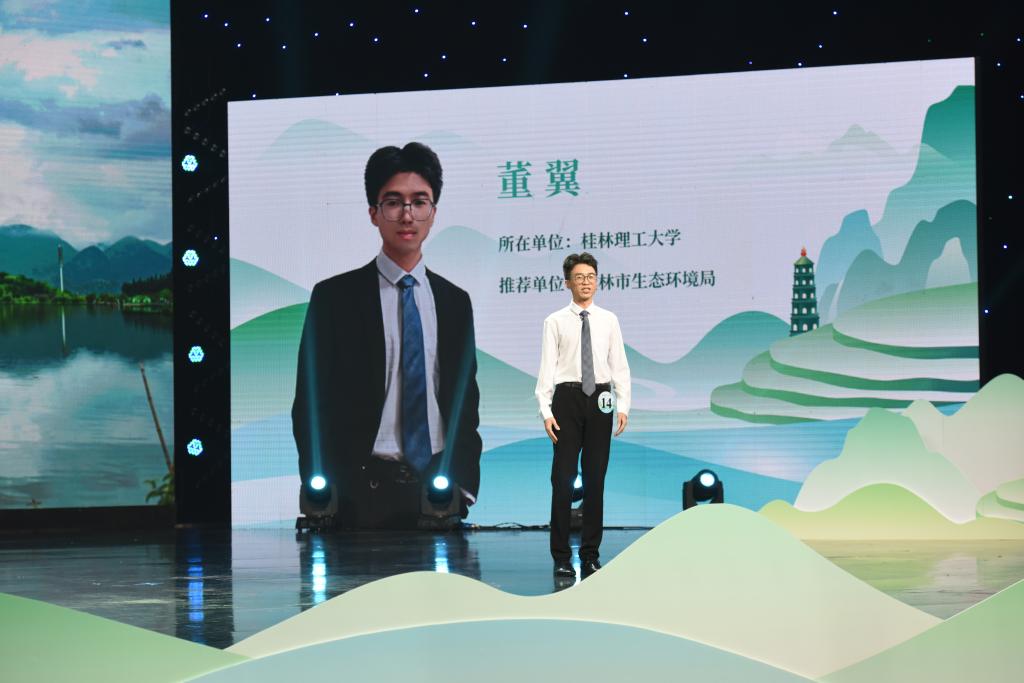 本次大赛共设置自主命题讲解、随机命题讲解+知识问答、才艺展示三个比赛环节,对选手的生态环保理论知识、专业素养以及环保科技创新能力等方面进行全方位、多角度考察。在自主命题环节中,董翼精心准备,围绕守护漓江生态屏障,带领大家共同认识和探索漓江生态屏障里的“大熊猫”——猫儿山。在随机命题讲解+知识问答环节中,董翼沉着冷静、机智应战,通过向观众分享常见的“宝藏”——矿泉水瓶,科普了“什么是固体废物资源化”,同时呼吁大家尊重和爱护生态环境。