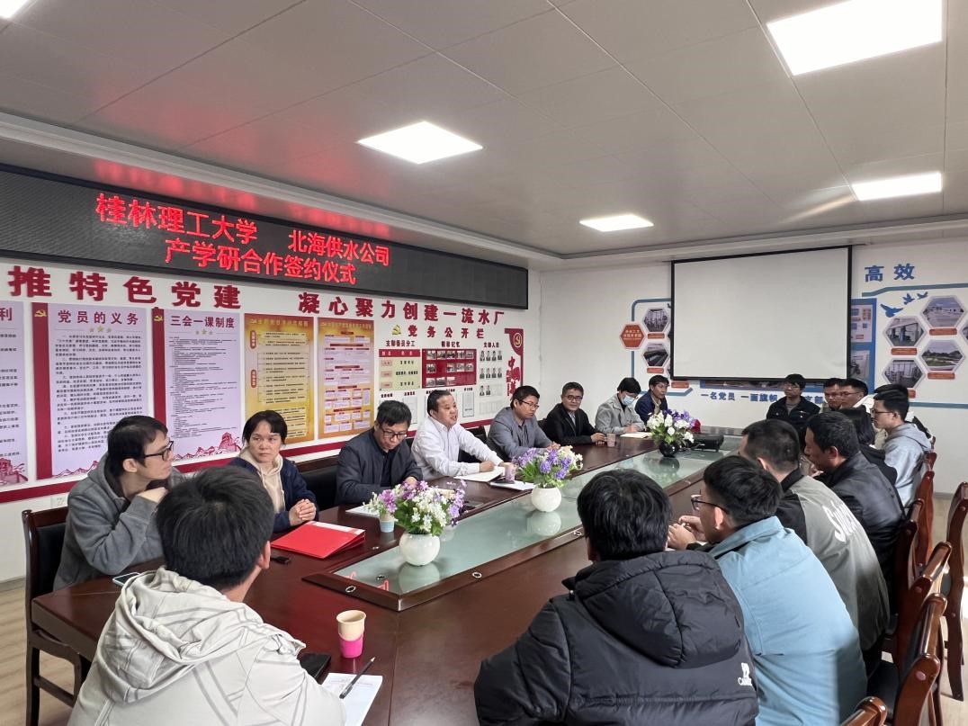 签约仪式后,李副院长与北海水司领导及历届桂林理工大学毕业的在职员工开展了座谈会,双方就校企产学研融合、人才培养等方面进行深入探讨,并达成共识。李副院长在发言中指出,产学研合作基地不仅为高校师生搭建了将理论知识转化为实际应用的平台,更为供水企业的技术创新和可持续发展注入了新的活力。双方将借助合作平台,充分发挥各自优势,实现资源共享、互利共赢。同时勉励桂林学子在工作岗位需兢兢业业、勤勉上进,为北海供水事业做出应有的贡献。