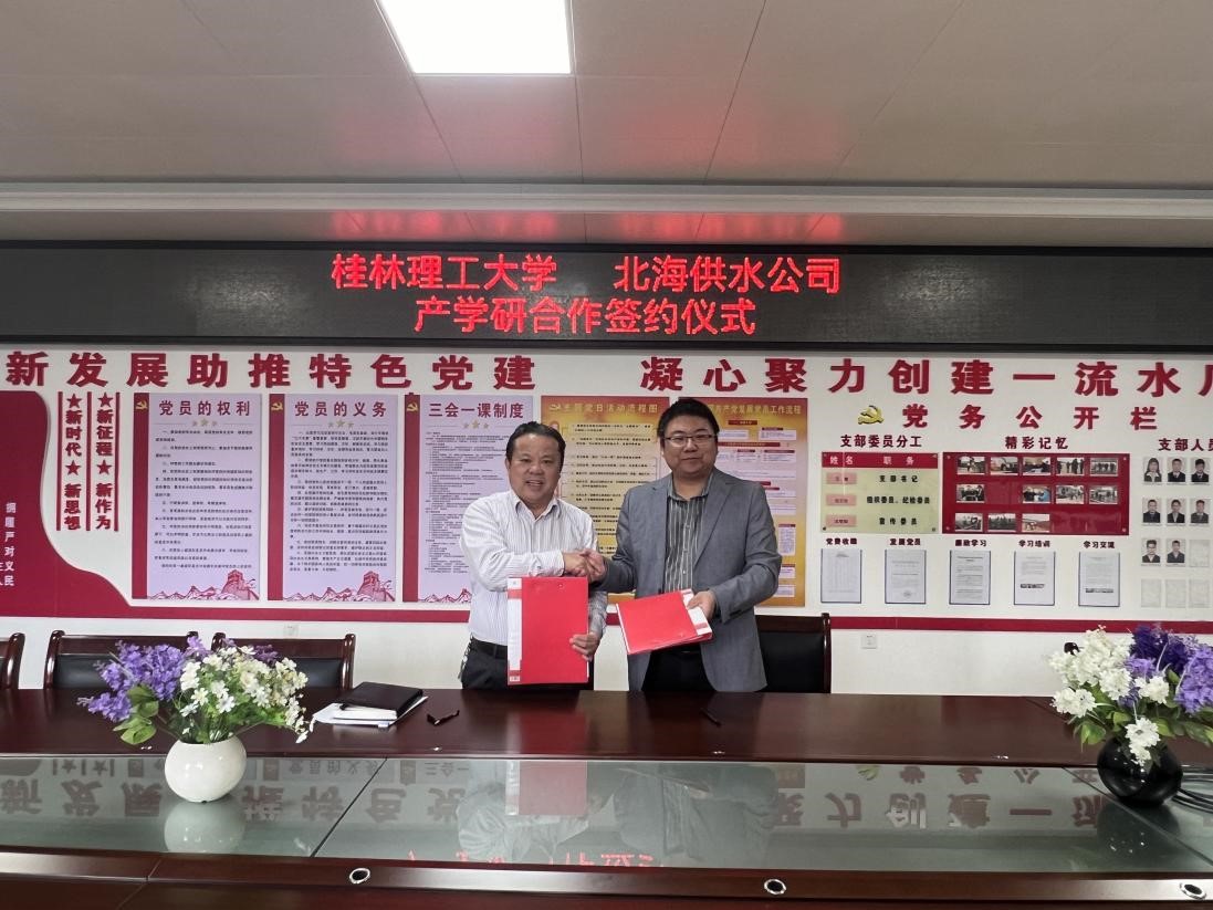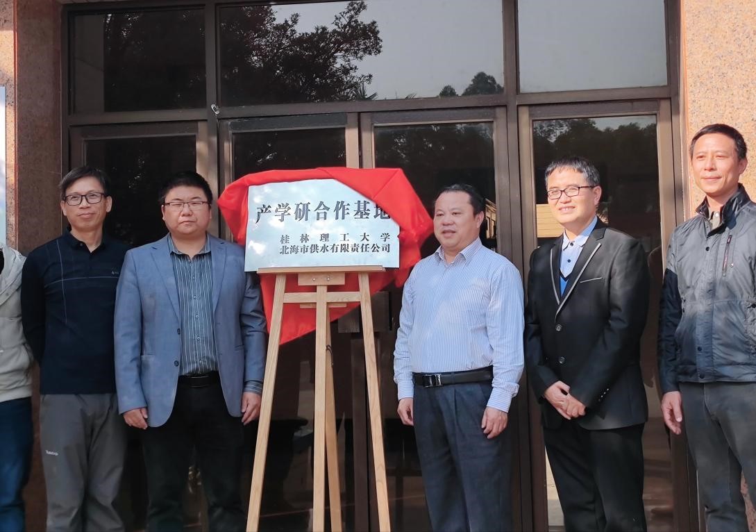 李海翔副院长与北海市供水有限责任公司签署了“产学研合作协议”,同时为桂林理工大学与北海市供水有限责任公司“产学研合作基地”揭牌。