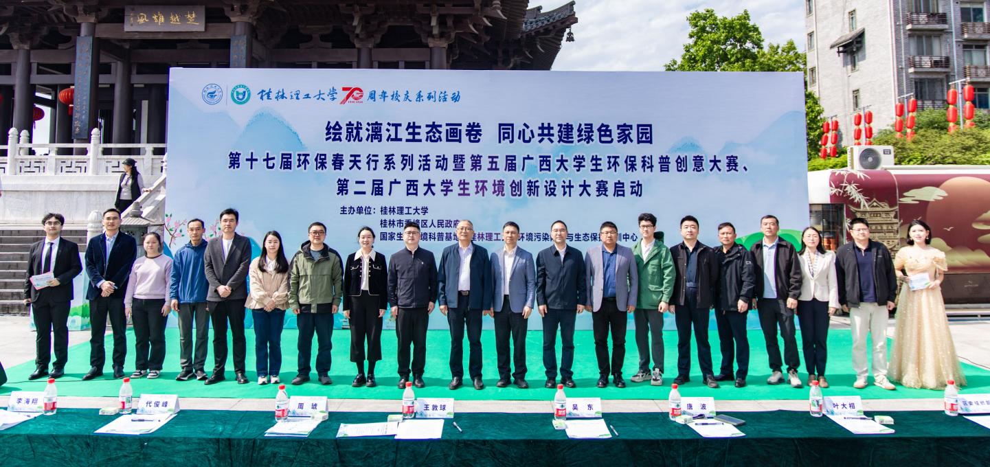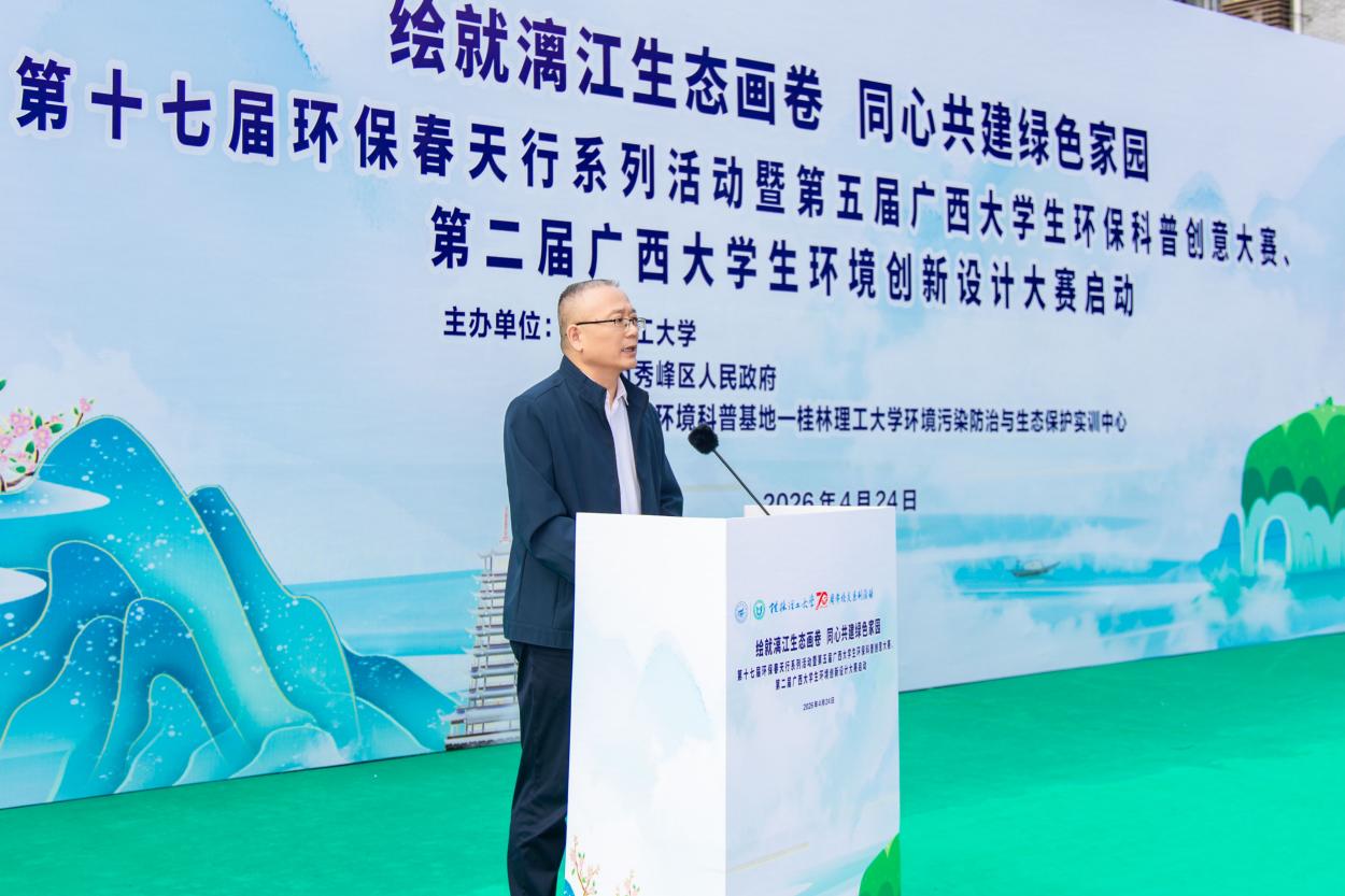 4月24日上午,在第五个桂林市“漓江保护日”、学校70周年校庆到来之际,为深入学习贯彻习近平生态文明思想,由桂林理工大学、桂林市秀峰区人民政府、国家生态环境科普基地—桂林理工大学环境污染防治与生态保护实训中心联合主办的第十七届“环保春天行”系列活动暨第五届广西大学生环保科普创意大赛、第二届广西大学生环境创新设计大赛启动仪式在桂林市秀峰区滨江路逍遥楼广场举行。学校党委副书记、校长王敦球,桂林市秀峰区委副书记周琥,学校、秀峰区相关职能部门负责人,学院领导班子,高校师生代表及环保志愿者代表等共同参与本次活动。