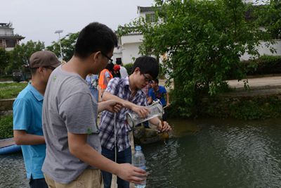 吴志强教授、代俊峰教授、黄亮亮博士、王盛老师,兴安县申遗办专家陈兴华等带领29名研究生开展了“环境生物与生态工程”课程教学实习及灵渠科学考察,科考的主题为“我为灵渠申遗做贡献”和“环保春天行”灵渠环境质量调研活动。课堂上同学们对灵渠的结构工程、人文历史、水利功能、气象水文等基础知识有了较全面的了解。实际考察中,研究生们从灵渠的铧嘴开始,经过水街、始安水、灵山庙、马头山、灵河口等地,完成了共计6个断面的采样。采集了水样、底泥、水草、鱼类、螺类等大量的样品,这些样品带回实验室,将分析重金属、理化指标、大肠杆菌,水体富营养化程度、水生植物种类、鱼类、底栖动物的鉴定等8项内容。研究生们还将撰写科考报告,研究结果将为灵渠申遗提供重要的参考数据。