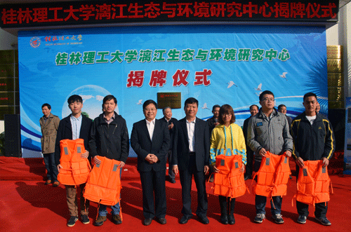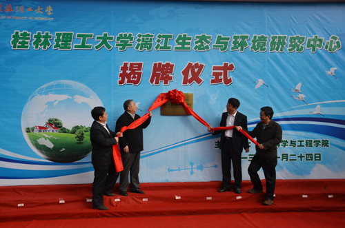 11月24日上午,我校“漓江生态与环境研究中心”揭牌仪式在雁山校区教九楼举行,中国科学院水生生物研究所曹文宣院士、水利部(中国科学院)水工程生态研究所所长常剑波研究员、我校校长解庆林教授、副校长吴志强教授共同为研究中心揭牌。