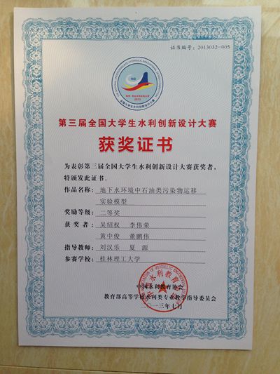 选送的参赛作品《地下水环境中石油类污染物运移实验模型》在比赛中荣获全国“二等奖”, 指导老师为十大赌博网站排行榜