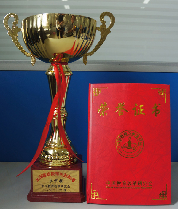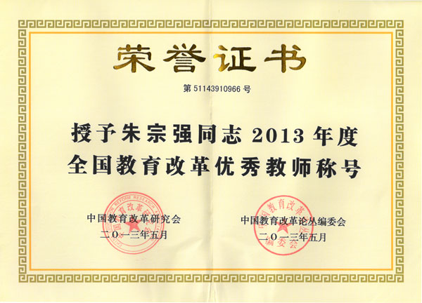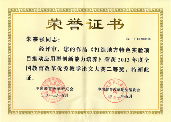 朱宗强老师作品《打造地方特色实验项目推动应用型创新能力培养》由于主题鲜明,论述有力,对教育改革具有一定的学术价值和贡献,荣获2013年度“全国教育改革优秀教学论文大赛二等奖”,同时,经研究会和杂志社联合推荐、评委会审核,朱宗强老师被授予2013年度“全国教育改革优秀教师”称号。