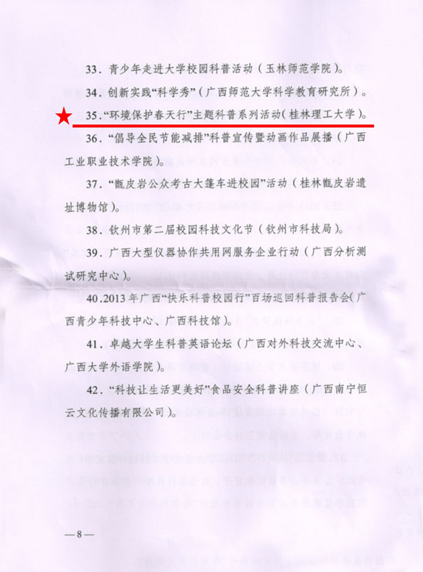申报的《“环境保护春天行”主题科普系列活动》以“青山碧水情 环保一生行”为活动主题,开展系列科普活动,收集相应素材,制成特色环保科普教育片,利用现有宣传媒介、网络平台将本项目活动主题辐射社会,积极传播、推广环境保护意识、弘扬环境保护的科学思想和科学精神。学院以精密的组织,切实的工作开展了丰富多彩的环保科普活动,获得良好的活动效果。活动得到评审单位的好评并获得“2013年度全国科技活动周广西活动优秀项目奖”。