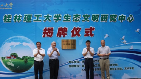 6月25日上午,桂林理工大学生态文明研究中心在屏风校区正式揭牌成立,中国科学院袁道先院士、广西人力资源和社会保障厅蒋劼副厅长、学校校长解庆林教授、副校长王敦球教授共同为研究中心揭牌。