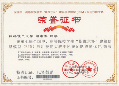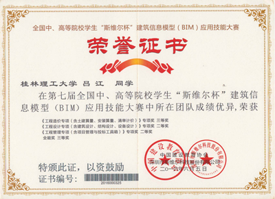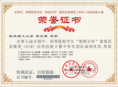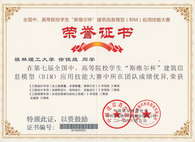 徐佳维等5名同学组成的“小霸王学习机”代表队分别获《工程设计专项(含建筑设计、结构设计、设备设计)》和《工程管理专项(含项目管理与投标工具箱)》2个全国专项二等奖,《工程造价专项(含土建算量、安装算量、清单计价)》全国专项三等奖和1个 全能三等奖的好成绩,并获得了本届比赛的优秀组织奖。
