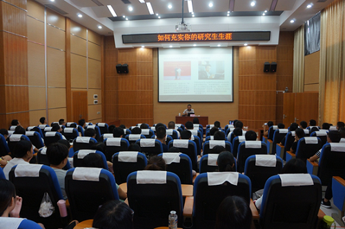 在雁山校区矿冶中心报告厅举办了2017级研究生新生教育专题大会,本次大会由李艳红副院长主持。我校副校长王敦球教授出席并做了《如何充实你的研究生生涯》的专题讲座。王敦球教授以平实的语言,从“学什么、如何学、勤奋、会学、勤动笔、勤动脑、勤动手、做人做事德才兼备”等多个方面,把研究生学习阶段几个重要的问题给研究生们作了详细的辅导。王教授语重心长、谆谆善诱,为研究生新生的学习和生活指明了方向,同学们都表示受益匪浅。
