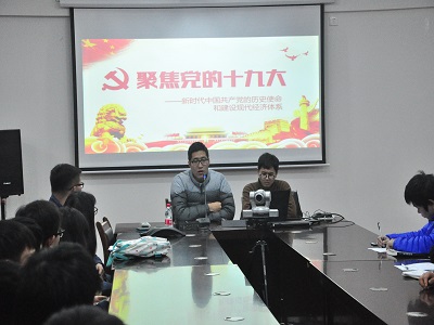 报告中,郝文佳同志从中国共产党第十九次全国代表大会简介及重要意义、如何理解把握“新时代”这一重大判断、新时代中国共产党的历史使命、建设现代化经济体系四个方面阐述了新时代中国共产党的历史使命和如何建设现代经济化体系的论点。会中同学们积极讨论、发言,现场气氛活跃。同学们也表示,在聆听了郝书记的报告之后加深了对党的十九大精神的理解。