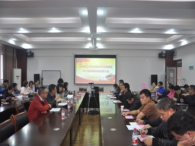 党委组织全院教职工在雁山校区萃华楼1407会议室开展集中的理论学习活动,学院在校领导班子参加学习会,党委书记姜子亮作专题报告。
