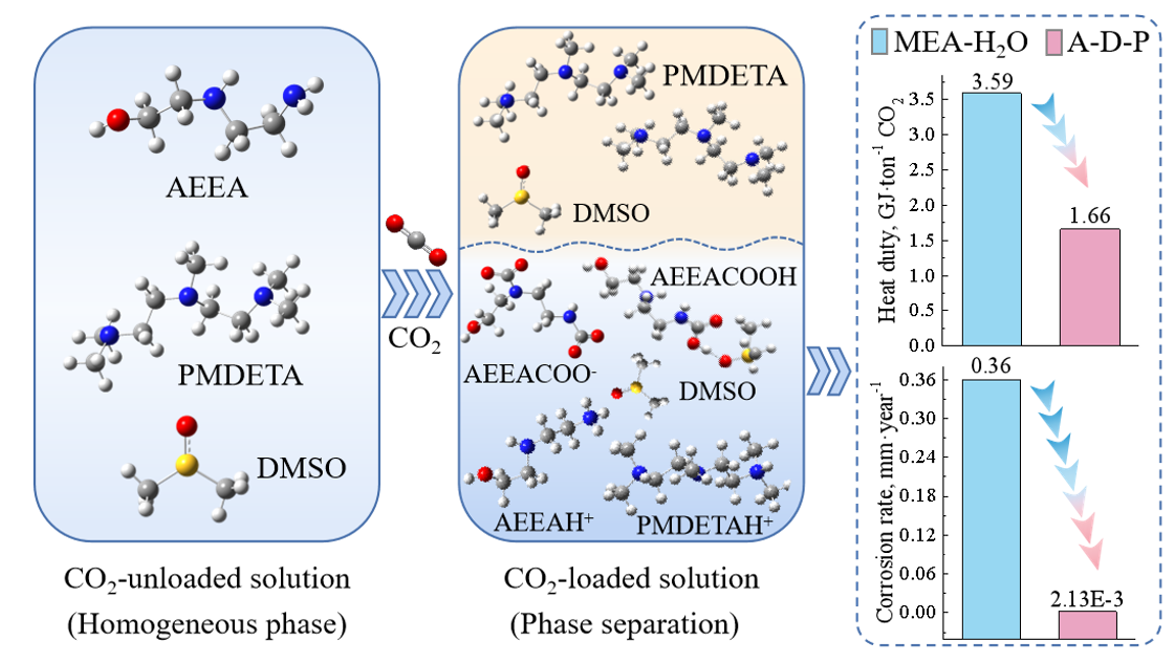 当今,全球气候变化的影响已在世界各地显现,且大量人为温室气体,尤其是CO2的排放正在加剧这一威胁。碳捕集、利用与存储(CCUS)技术是控制CO2排放的有效手段,该技术的关键在于将CO2从烟气中分离出来。针对烟气排放量大且CO2分压低的特点,利用化学吸收法进行CO2捕集相对高效。两相胺是近年来开发的一类新型CO2吸收剂,该类吸收剂的特点在于吸收CO2后发生液-液相变,CO2主要富集在其中一相,因此只需将CO2富相用于解吸,即可大幅降低吸收剂的再生能耗。但目前大部分报道的两相胺为水系吸收剂,仍面临较高的再生能耗和设备腐蚀性问题。鉴于此,论文作者团队以羟乙基乙二胺为吸收促进剂、二甲基亚砜为有机稀释剂、五甲基二乙烯三胺为相变促进剂,开发了一种新型非水液-液相变吸收剂用于CO2捕集。研究发现,新型相变吸收剂的CO2吸收负荷高达1.75 mol CO2/mol胺,且富相体积仅占溶液总体积49.6%。热力学研究表明,该新型相变吸收剂的再生能耗仅为1.66 GJ/ton CO2,比传统乙醇胺水溶液降低53.8%。此外,电化学腐蚀测试表明,新型吸收剂吸收CO2后对碳钢几乎没有腐蚀性。