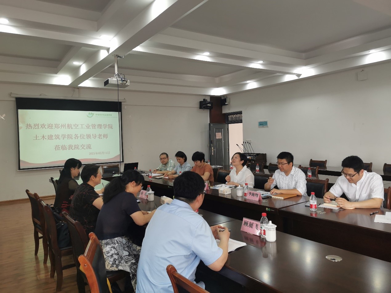 2021年5月11日,郑州航天工业管理学院土木建筑学院在院长薛茹教授带领该校给排水系的专业负责人高军侠教授,系主任李莲秀副教授到十大赌博网站排行榜 与给水排水教研室的相关老师进行交流。十大赌博网站排行榜 的相关领导和给水排水教研室的老师出席了交流会。