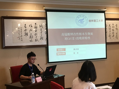 张华老师等人参加了该会议,2020级研究生莫贞林在研究生专场做了“高锰酸钾改性桉木生物炭对Cd(Ⅱ)的吸附特性”的专题汇报,介绍了目前重金属的污染概况、锰氧化物负载生物炭的利用以及对Cd(Ⅱ)的吸附机理相关方面研究。