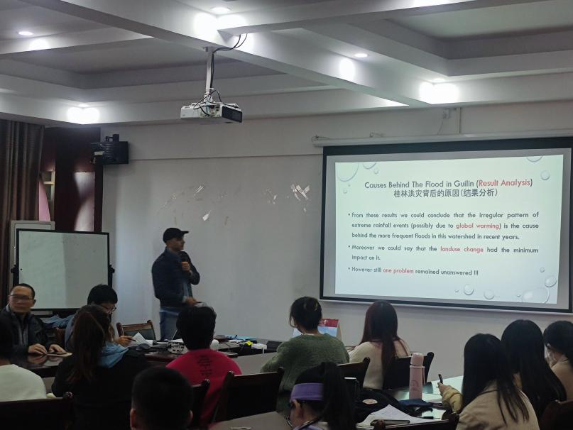 讲座伊始,Saeed Rad博士向参会人员介绍了自己的研究方向与目标,鼓励同学们营造良好的学术氛围和培养严谨的科学思维。随后,在报告中Rad博士为同学们讲解了课题组所研究的区域以及漓江水质和水资源、灌溉和排水的研究目的,用生动例子阐释如何解决漓江洪灾问题,使用GIS地图、DEM图层、GIM云等方法对“桂林洪灾背后的原因”作处理分析,阐述了水坝建造对减弱桂林洪灾的影响,介绍桂林卡斯特地貌的特点特征以及桂林土壤水分损失的计算,为研究桂林洪水灾害提供有力支持与帮助。
