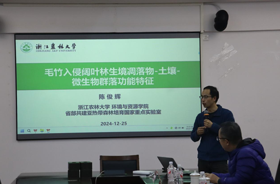 报告会上,陈教授以主持的科研项目为基本框架,从项目背景、科学问题、研究结果和结论与展望4个方面深入阐述了毛竹入侵亚热带阔叶林后凋落物-土壤-微生物群落三者之间的关系发生演变的过程和机制。