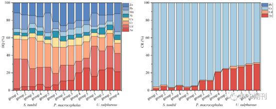 3种鱼类体内PTEs对非致癌健康风险(HQ)和致癌健康风险(CR)的贡献