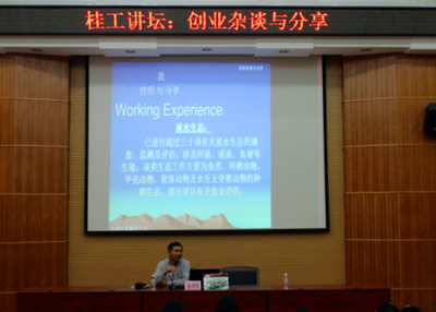 特邀中港生态顾问公司佘书生博士在雁山校区萃华楼报告厅举行的以《创业杂谈与分享》为主题的桂工讲坛,环工专业同学聆听讲座。