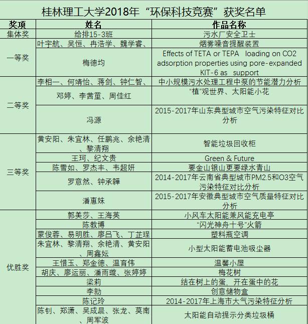 由十大赌博网站排行榜 举办的林理工大学2018年“环保科技竞赛”在近日圆满落下帷幕。本次大赛得到了桂林理工大学各学院师生的广泛关注,共收到一百多名同学的七十余份参赛作品。经过层层选拔,大赛共评出集体奖1项,一等奖2项、二等奖3项、三等奖5项、优胜奖10项,相关获奖信息如下表所示。按下表进行公示,公示期7天,如有异议请与十大赌博网站排行榜 杲俊宇同学联系,电话:15296572113。