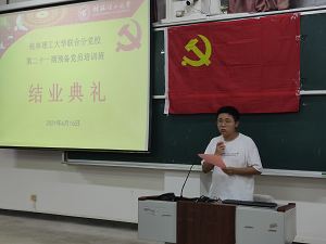 首先,杨平平老师为本次结业典礼致辞。杨老师对本期培训班授课教师表示衷心的感谢,并肯定了学员们的学习,对顺利结业的学员表示祝贺。同时杨老师也提醒学员们,学习培训虽然结束,但这仅是一个开始,希望同志们以这个开始作为新起点、新动力,在未来的学习生涯中发挥出党员的先锋模范带头作用。随后由优秀学员代表孔艺衡同学发表感言。孔艺衡同学表示,通过培训对党的基本理论,基本路线,基本纲领,基本经验以及党员的权利与义务有了更深刻的认识,也希望大家要理论指导实践,加强党性修养,树立马克思列宁主义的世界观、人生观和价值观,坚定共产主义的理想信念;遵守党的政治纪律;提高科学素质,加强道德修养和文明水平。